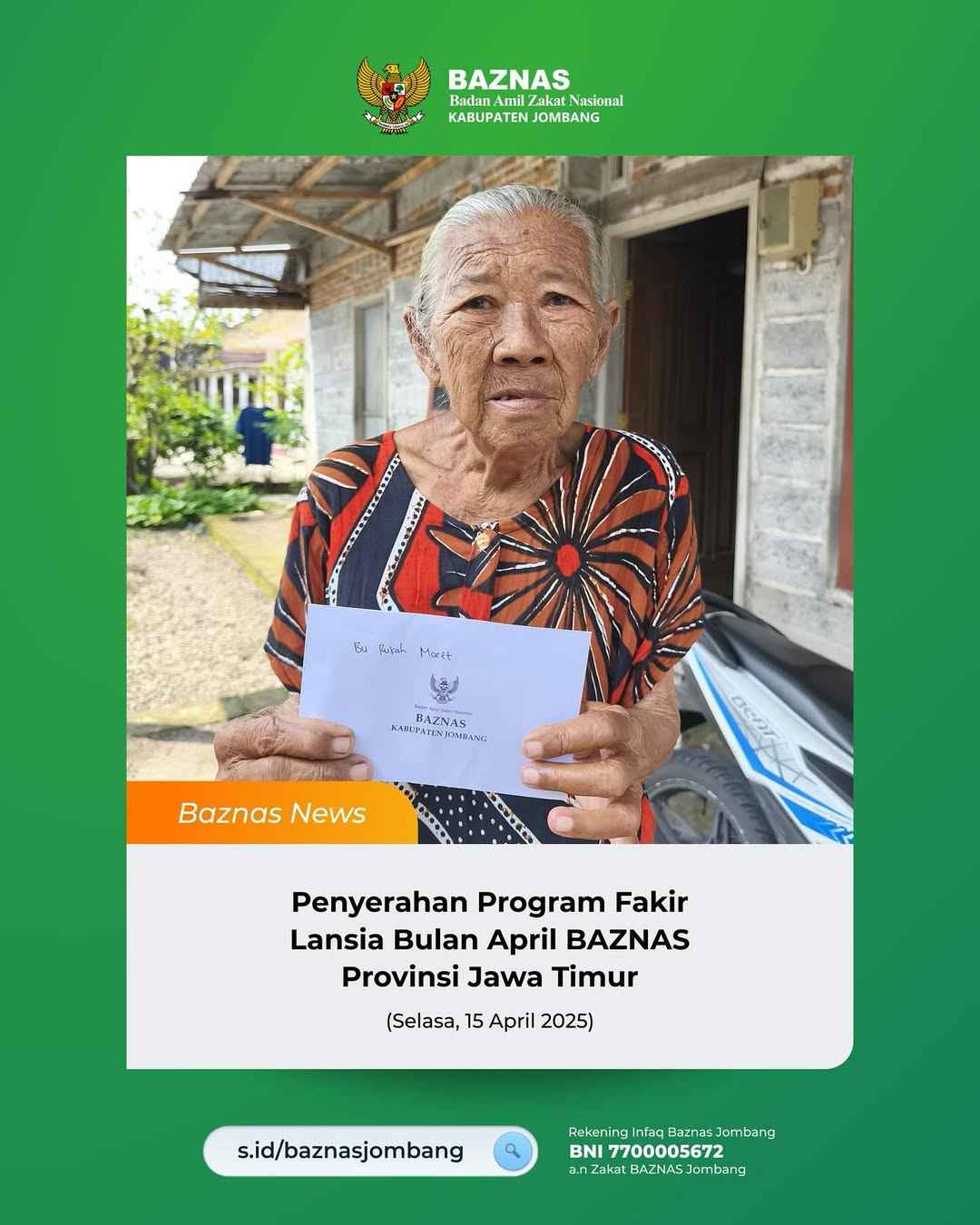 Jombang – Baznas Kabupaten Jombang kembali menyalurkan bantuan dalam Program Fakir Lansia pada bulan April 2025. Penyerahan bantuan dilakukan pada Selasa, 15 April 2025, sebagai bagian dari program kolaborasi antara Baznas Provinsi Jawa Timur dan Baznas Kabupaten Jombang yang bertujuan untuk membantu warga lanjut usia yang masuk dalam kategori fakir.