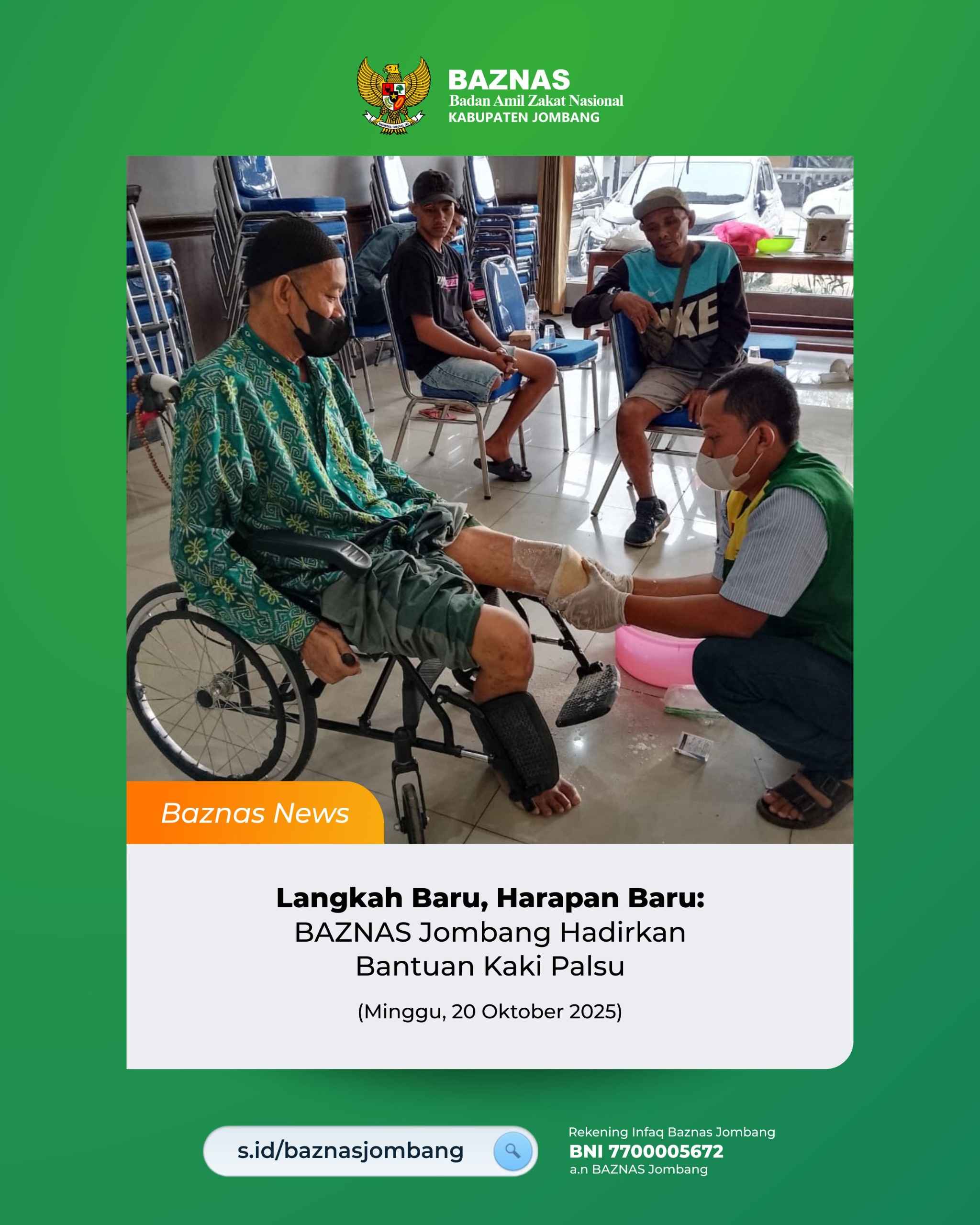 Jombang — Suasana haru menyelimuti aula Islamic Center Jombang pada Minggu (19/10/2025), ketika Badan Amil Zakat Nasional (BAZNAS) Kabupaten Jombang melaksanakan proses pengukuran kaki palsu bagi lima penerima manfaat. Kegiatan ini menjadi bagian dari komitmen BAZNAS dalam menghadirkan solusi nyata bagi masyarakat penyandang disabilitas agar dapat kembali melangkah dan hidup mandiri.