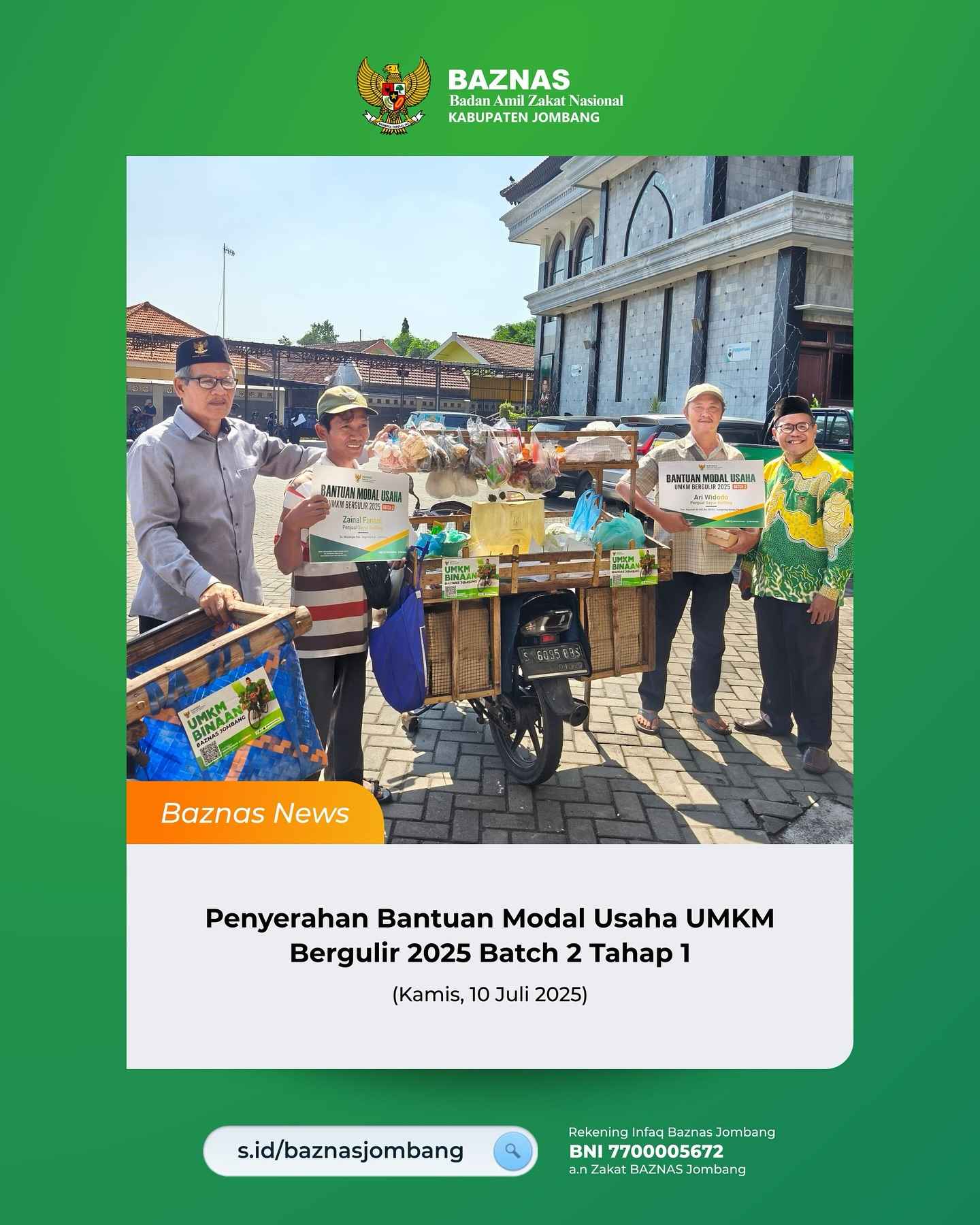 Jombang, 10 Juli 2025 — BAZNAS Kabupaten Jombang kembali menyalurkan Bantuan UMKM Bergilir Batch 2 Tahun 2025 yang bertempat di Aula Islamic Center BAZNAS Jombang.