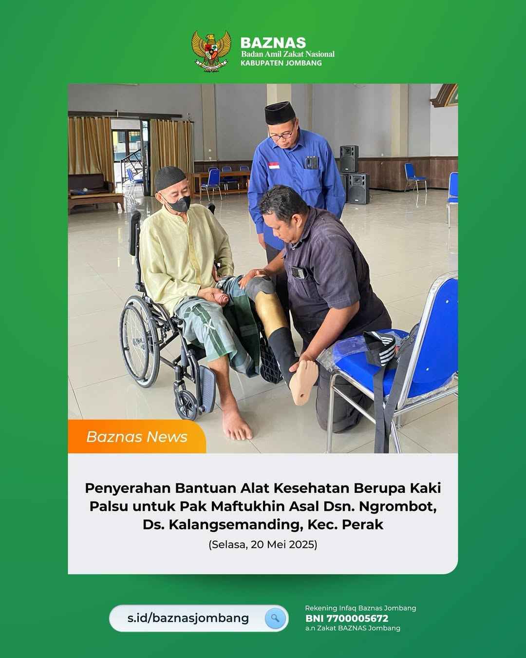 Jombang, 20 Mei 2025 - Komitmen dalam menebar manfaat dan mendukung kemandirian masyarakat terus ditunjukkan oleh Baznas Kabupaten Jombang. Pada Selasa (20/5), Baznas menyerahkan bantuan kaki palsu kepada Bapak Maftukhin, warga Dusun Ngrombot, Desa Kalangsemanding, Kecamatan Perak