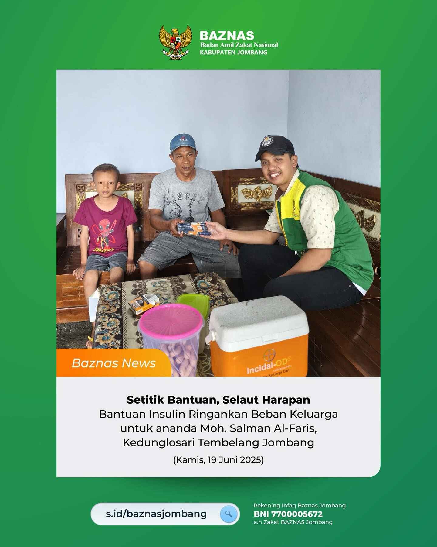 Bantuan insulin ini merupakan upaya BAZNAS Jombang untuk meringankan beban keluarga Salman. Setiap tetes insulin yang disalurkan tidak hanya berfungsi sebagai obat, tetapi juga menjadi simbol harapan agar Salman dapat terus tumbuh dan beraktivitas layaknya anak-anak seusianya.