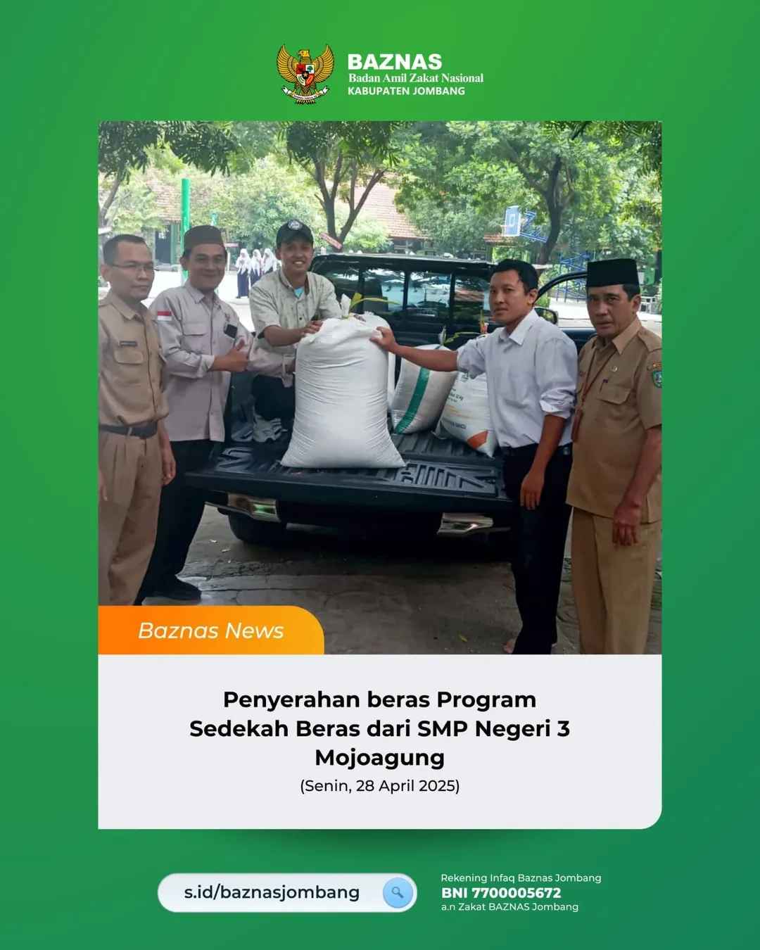 Jombang - Komitmen untuk menumbuhkan semangat berbagi sejak dini kembali ditunjukkan oleh keluarga besar SMP Negeri 3 Mojoagung melalui program unggulan mereka, Program Sedekah Beras. Pada Senin (28/4/2025), Baznas Kabupaten Jombang mnerima sebanyak 223 kilogram beras dari program tersebut, yang diserahkan langsung oleh pihak sekolah sebagai bentuk partisipasi rutin dalam gerakan kebaikan.