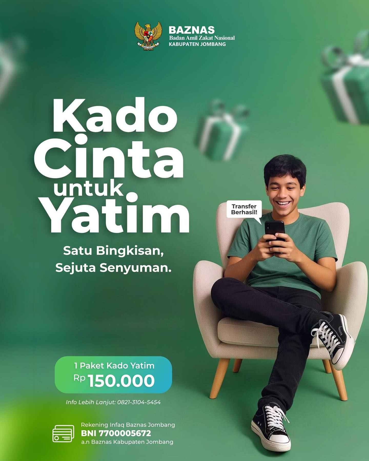 Jombang – BAZNAS Kabupaten Jombang kembali mengajak masyarakat untuk menebar kepedulian melalui program “Kado Cinta untuk Yatim”. Dengan donasi sebesar Rp150.000, masyarakat dapat berkontribusi menghadirkan kebahagiaan di hati anak-anak yatim yang membutuhkan.