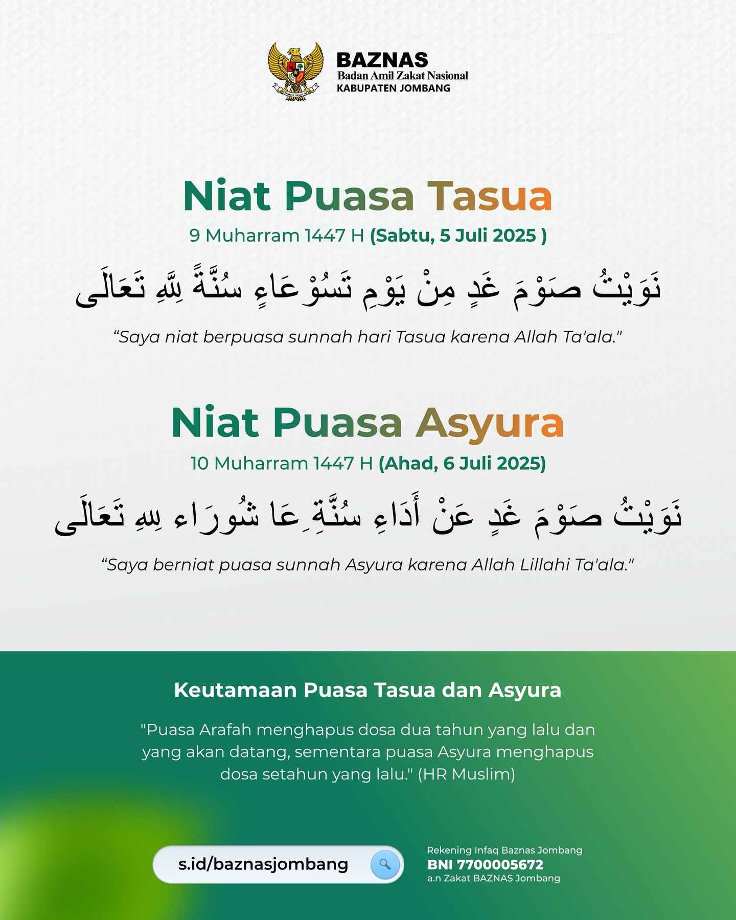 Memasuki hari-hari istimewa dalam bulan Muharram, yaitu Tasu’a dan ‘Asyura, Baznas Kabupaten Jombang mengajak masyarakat untuk memperkuat ibadah dengan berbagi kepedulian. Dua hari ini bukan sekadar momen puasa sunnah, tetapi juga waktu yang tepat untuk menyucikan jiwa, mempererat hubungan dengan Allah, dan menunjukkan kasih sayang kepada sesama.