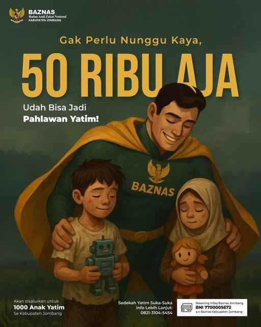Pahlawan Yatim bukan berasal dari planet Krypton, bukan pula sosok dengan jubah dan kekuatan super. Mereka adalah kita, orang-orang biasa yang punya kepedulian luar biasa. Di bulan Muharram yang penuh berkah ini, BAZNAS Kabupaten Jombang mengajak masyarakat untuk menjadi bagian dari 1.000 Pahlawan Yatim, sebuah gerakan sederhana namun berdampak besar bagi anak-anak yatim dan piatu di Jombang.