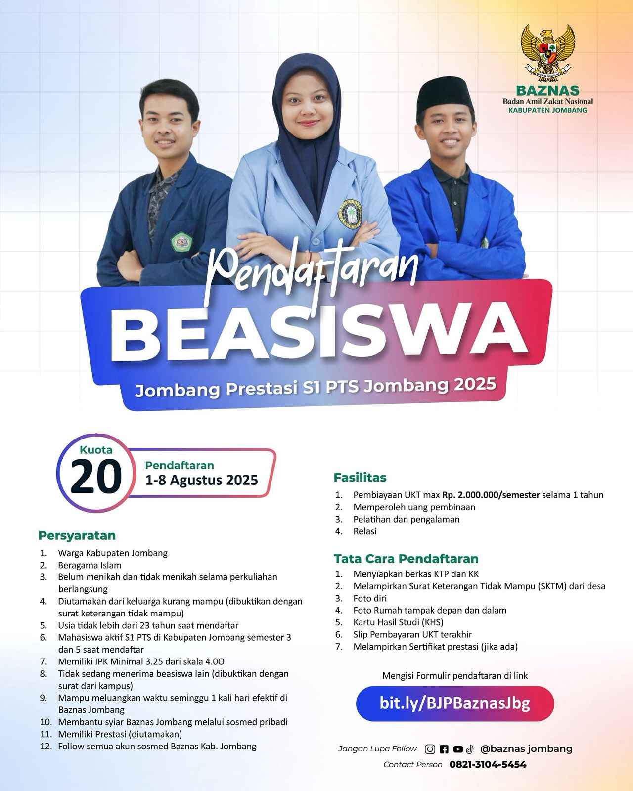 Bagi kamu mahasiswa aktif di Perguruan Tinggi Swasta (PTS) wilayah Kabupaten Jombang, yuk manfaatkan kesempatan ini untuk mendapatkan dukungan dari BAZNAS Kabupaten Jombang.