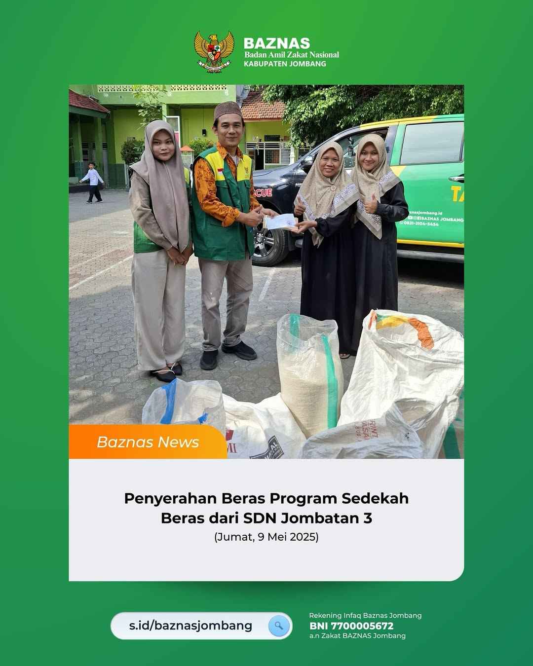 Jombang, Jumat 9 Mei 2025 — Program kebaikan bertajuk Sedekah Beras kembali dilaksanakan, kali ini secara perdana oleh SDN Jombatan 3 yang berhasil mengumpulkan dan menyerahkan sebanyak 113 kilogram beras kepada Baznas Kabupaten Jombang.