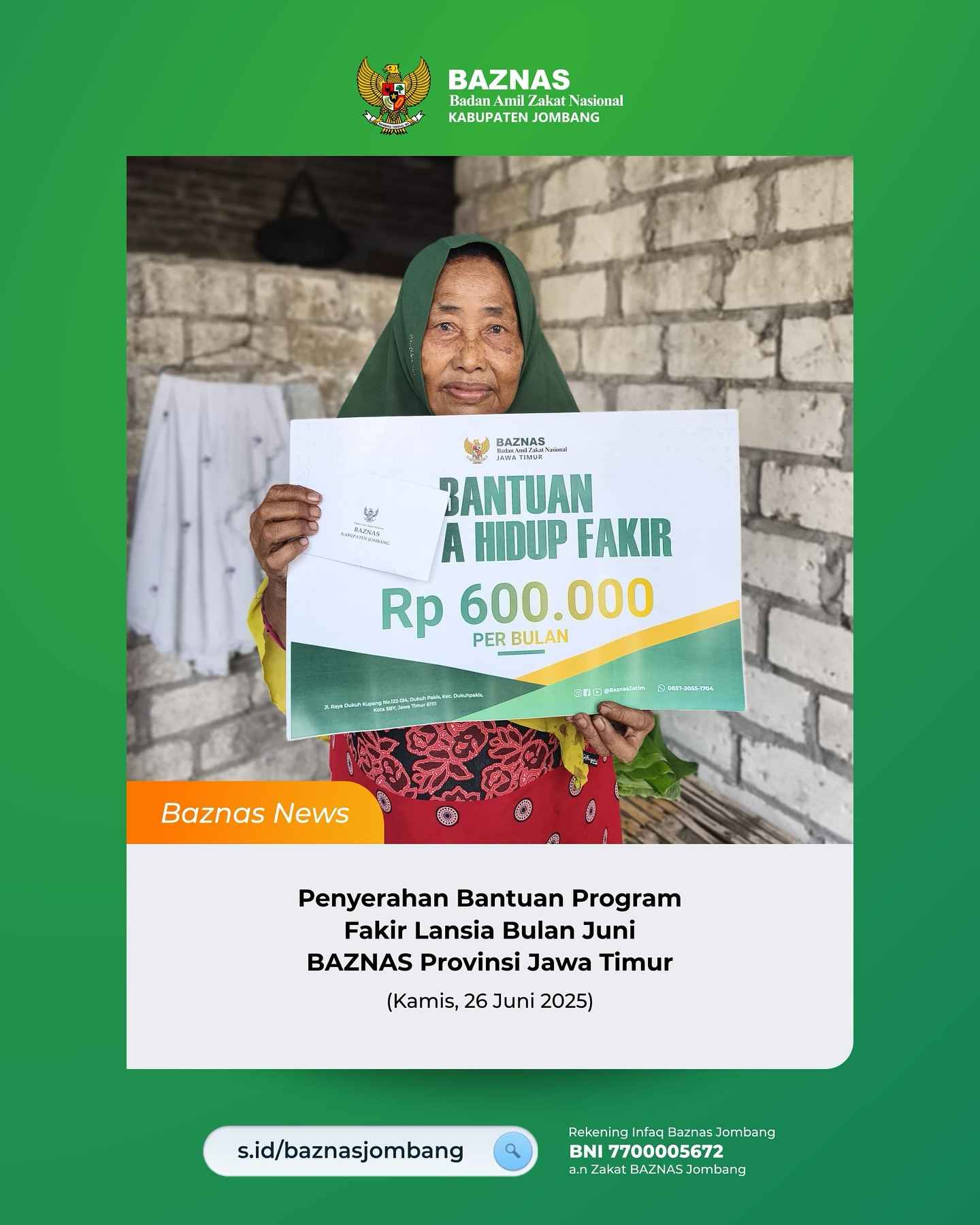 Jombang – Baznas Kabupaten Jombang kembali menyalurkan bantuan dalam Program Fakir Lansia pada bulan Juni 2025. Penyerahan bantuan dilakukan pada Kamis, 26 Juni 2025, sebagai bagian dari program amanah Baznas Provinsi Jawa Timur yang dipercayakan kepada Baznas Kabupaten Jombang untuk membantu warga lanjut usia yang membutuhkan.