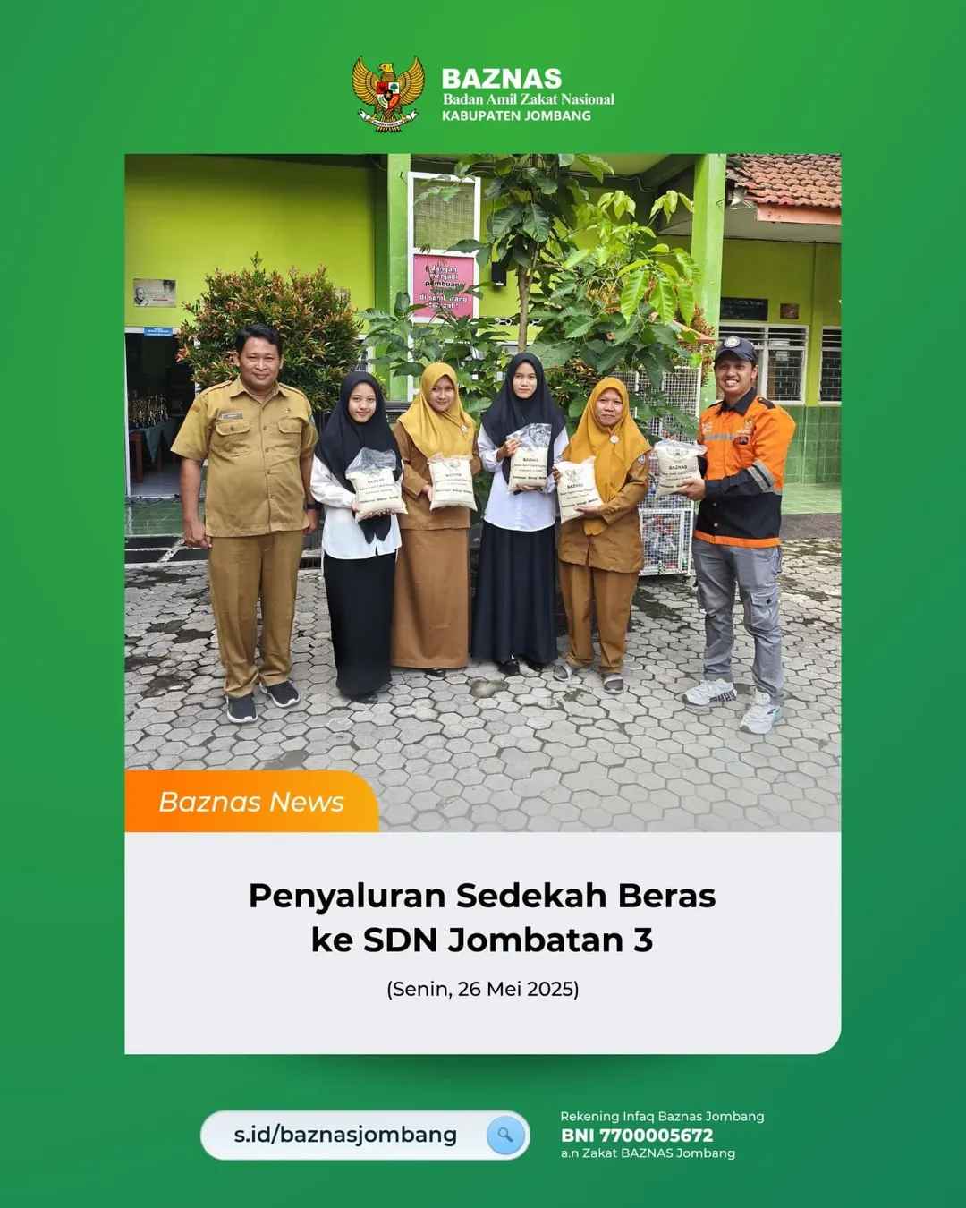 Jombang, 26 Mei 2025 - Semangat berbagi kembali di tunjukkan oleh siswa- siswi SD Negeri Jombatan 3, yang melaksanakan penyerahan Sedekah Beras kepada Baznas Kabupaten Jombang pada Senin (26/5). Penyerahan ini merupakan bagian dari Program Sedekah Beras yang rutin dilaksanakan oleh Unit Pengumpul Zakat (UPZ) sekolah yang berada di bawah koordinasi Bzanas Kabupaten Jombang.