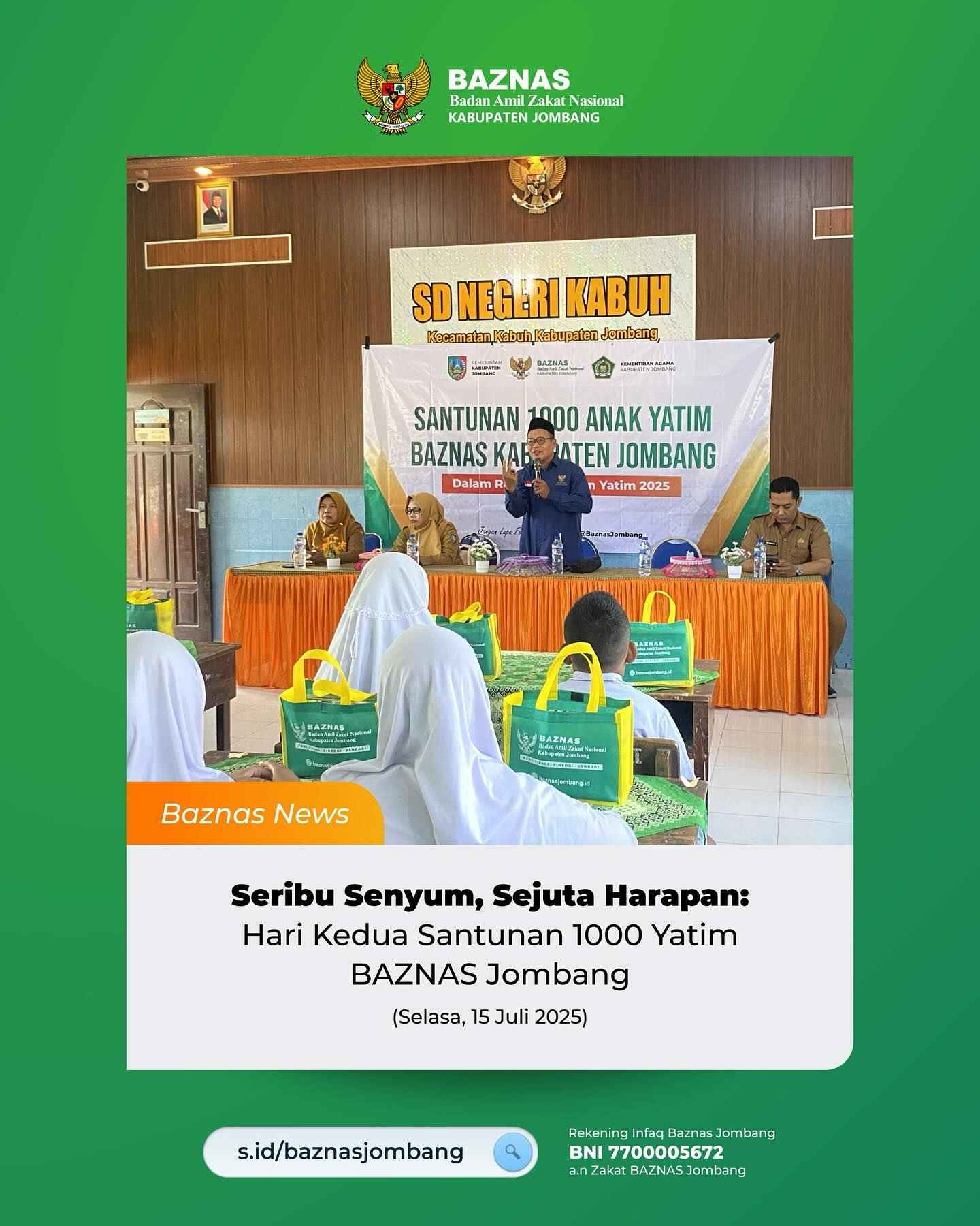 Jombang, 16 Juli 2025 - Seribu senyum, sejuta doa mengiringi pelaksanaan hari kedua program Santunan 1.000 Anak Yatim yang diselenggarakan oleh BAZNAS Kabupaten Jombang. Kegiatan yang berlangsung dengan penuh keberkahan ini menjadi wujud nyata dari kepedulian sosial masyarakat Jombang terhadap anak-anak yatim yang membutuhkan uluran tangan kasih sayang.