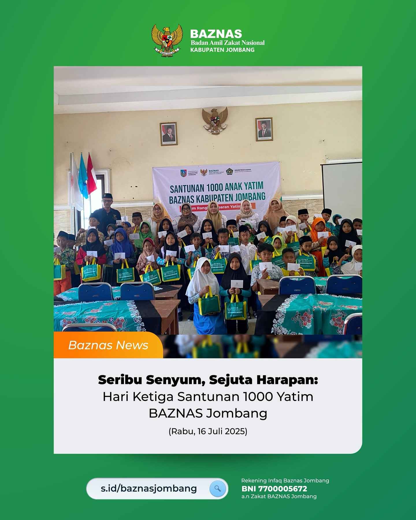 Jombang, Rabu 17 Juli 2025 — Seribu senyum dan sejuta doa kembali mewarnai pelaksanaan hari ketiga Program Santunan 1.000 Anak Yatim yang diselenggarakan oleh BAZNAS Kabupaten Jombang. Kegiatan yang penuh keberkahan ini menjadi momentum istimewa untuk menghadirkan kebahagiaan bagi anak-anak yatim di bulan Muharram, bulan yang penuh dengan limpahan rahmat dan kasih sayang.