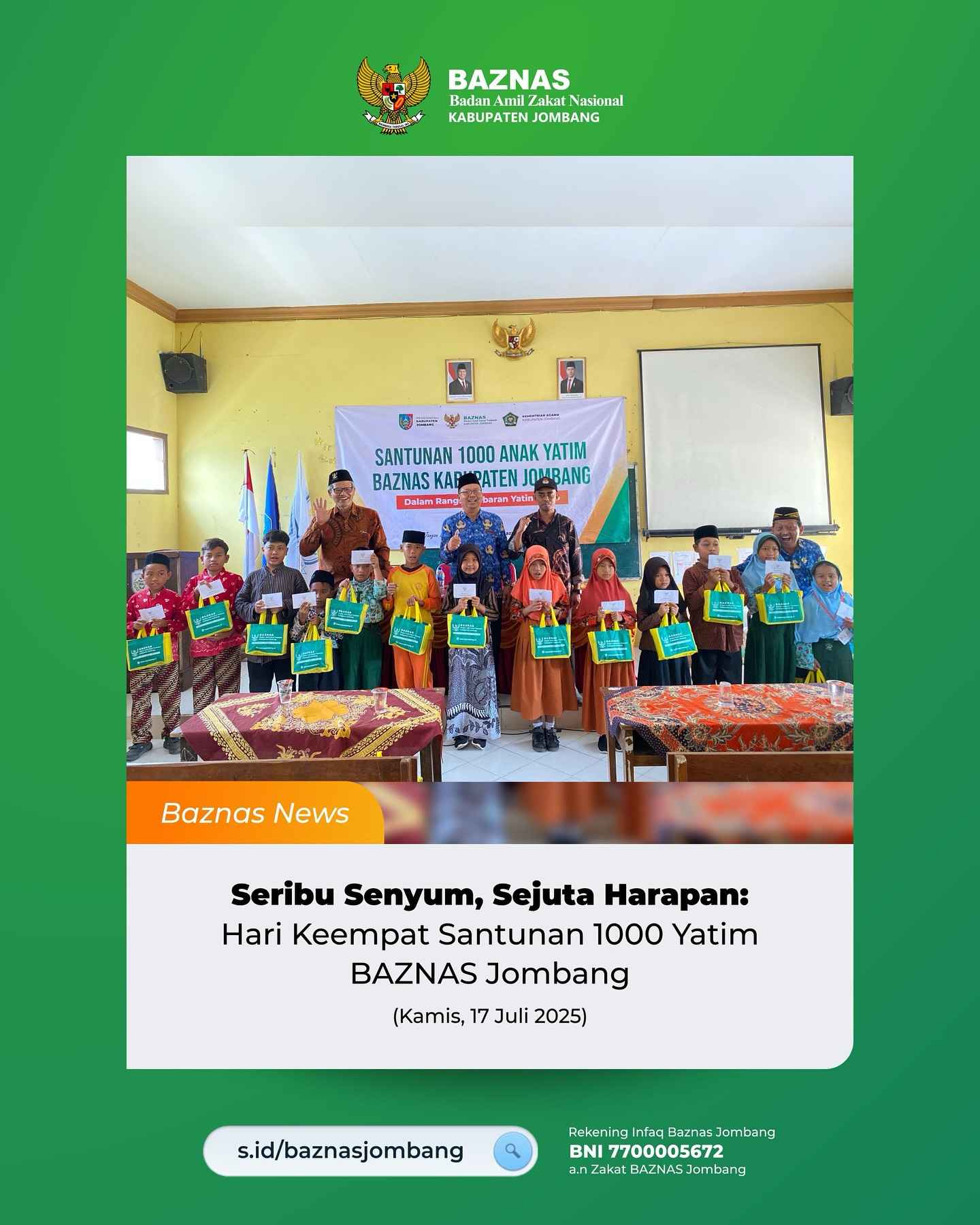 Jombang, Kamis 18 Juli 2025 — Seribu senyum dan sejuta doa menutup rangkaian pelaksanaan Program Santunan 1.000 Anak Yatim yang diselenggarakan oleh BAZNAS Kabupaten Jombang. Hari terakhir kegiatan ini berlangsung dengan penuh keberkahan, menjadi penutup yang manis atas ikhtiar bersama dalam menghadirkan kebahagiaan bagi anak-anak yatim di bulan Muharram yang mulia ini.
